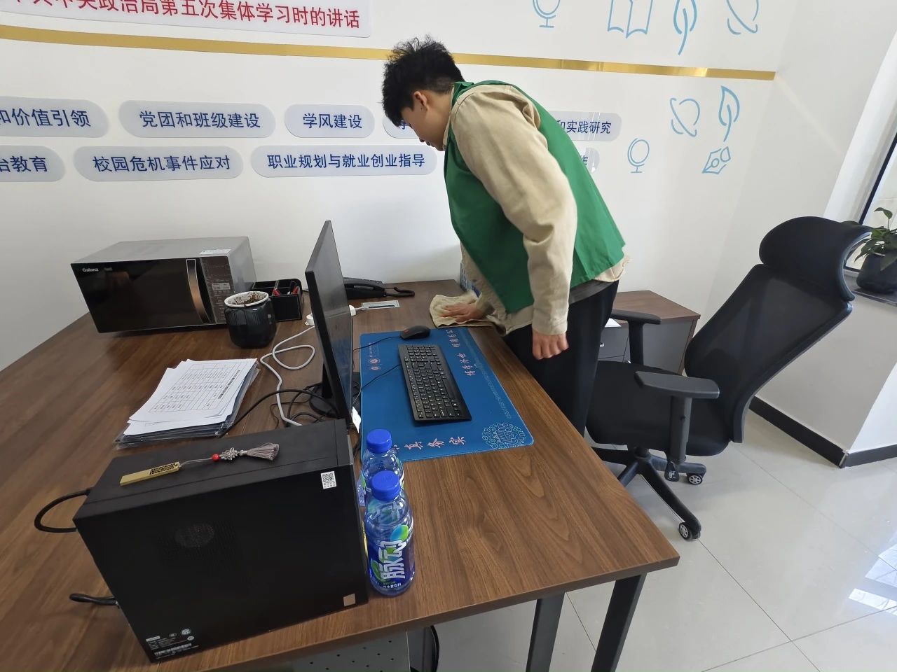 辅导员工作站和学生活动室是师生、同学们日常交流学习的重要场所,但高频使用后难免留下杂物与灰尘。本次清扫活动以“劳动+环保”为核心理念,号召学生从身边小事做起,践行雷锋精神的奉献底色与生环学子的环保担当。