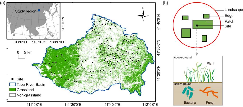 为此,张庆教授团队以内蒙古农牧交错带破碎化景观中残存草地为研究对象,综合探讨了景观与斑块尺度生境破碎化对植物、土壤细菌、土壤真菌多样性及生态系统多功能性的影响(图1)。研究发现,景观尺度和斑块尺度破碎化通过等级效应共同导致了内蒙古农牧交错带破碎化草地植物多样性、土壤微生物多样性和生态系统多功能性的降低。并且,斑块尺度破碎化可以介导景观尺度破碎化对生物多样性和生态系统多功能性的负面影响。