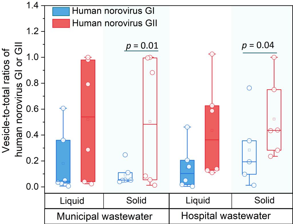 长期以来,学术界普遍假设肠道病毒以独立的游离颗粒形式传播,但实际上它们也能形成具有更强环境持久性和消毒耐受性的病毒集群。其中,病毒囊泡(亦称囊泡相关病毒)作为一种近年来被发现的新型致病单元,正严重威胁人类健康。病毒囊泡是磷脂双分子层包裹或通过表面结合多个病毒颗粒的单元,已被确认为柯萨奇病毒、诺如病毒、脊髓灰质炎病毒及轮状病毒等关键的传播与感染机制。相较于游离病毒颗粒,病毒囊泡具有更强的感染性,因为囊泡中隐藏的多个病毒颗粒可以提高其感染复数,并促进突变或受损病毒的遗传重组/重配。此外,病毒囊泡还能通过包膜掩蔽抗体识别,并利用其含有的免疫抑制性磷脂酰丝氨酸(PS)脂质抑制免疫激活,从而逃避宿主免疫系统的打击。尽管这种高感染性和高耐受性的病毒囊泡引起了巨大的公共卫生担忧,但由于从复杂环境基质中分离囊泡的技术挑战,其在环境中的普遍性仍尚未可知。