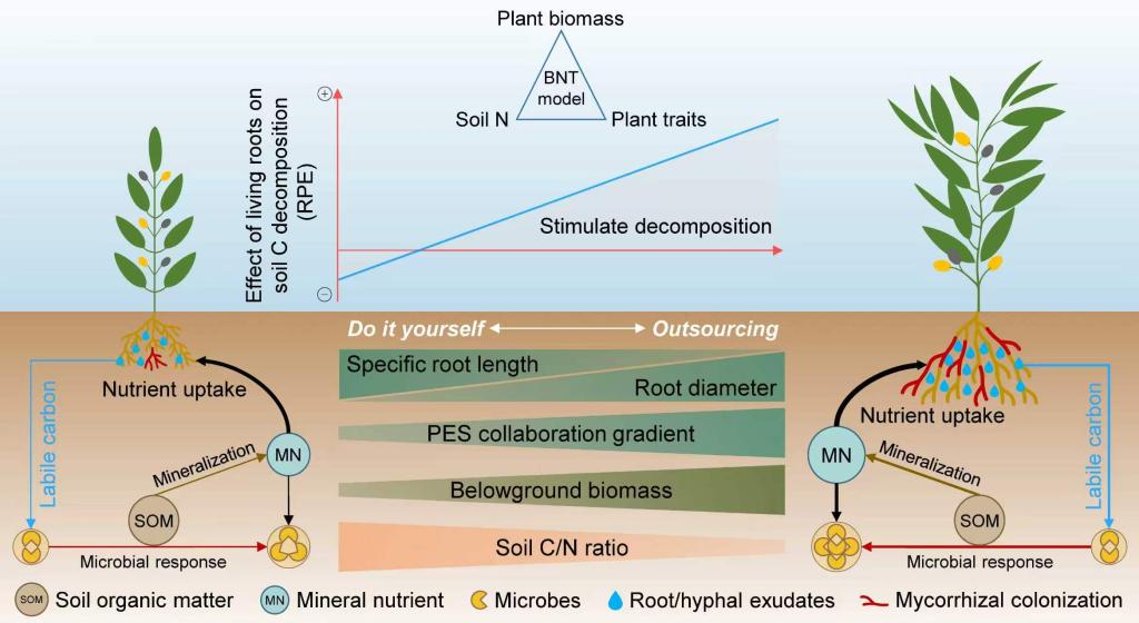 通过整合全球范围内的RPE实验(图1),探究了全球尺度上RPE变异的影响因素与驱动机制。发现,RPE使土壤有机碳分解平均增加49%,但RPE强度存在较大的变异(−50%至349%)。植物地下生物量、植物功能性状沿植物经济空间的协作梯度(从自己动手到外包)以及土壤碳氮比共同驱动RPE的全球变异;其中,前两个因素与RPE呈正相关关系,而土壤碳氮比与RPE呈负相关关系。基于此,本研究提出了一个“生物量—氮—性状”框架:在低碳氮比土壤中,高生物量、粗根植物(外包型策略)比低生物量、细根植物(自己动手型策略)对土壤碳分解的促进作用更为强烈(图2)。本研究揭示了植物生物量、植物功能性状以及土壤养分供应能力在根际激发效应中的共同驱动作用,为解释为什么仅考虑植物性状难以有效预测生态系统属性和功能提供了重要见解,并表明植物性状需要与其他生态属性结合考虑,才能更好地预测生态系统功能。此外,本研究提供了植物经济空间的协作梯度能够影响微生物分解和生物地球化学循环的新视角,拓展了以往主要基于地上性状提出的植物“快–慢”策略如何影响根际激发效应、微生物活性以及土壤碳储存的认识,并有助于更好地预测全球变化背景下植物群落物种组成和功能性状变化对地下生态系统功能的影响。