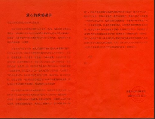 环境与资源学院得知这一消息后,非常关切,学生会在全院师生中发起倡议,为刘永新同学捐款,两天时间内共计捐款1500多元,有的同学把积攒多年的零用钱捐了出来,钱虽不多,却也体现了环境与资源学院师生的爱心、奉献精神,表达了环境与资源学院20余名教职工和160名同学力所能及的帮助,也带去了学院全体师生的良好祝愿,衷心祝愿刘永新同学早日康复,继续完成学业,早日成才!