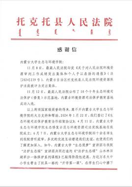 2024年11月20日,yl6809永利官网集团收到托克托县人民法院的感谢信,与yl6809永利官网集团建有“法院+高校”合作关系的托克托县人民法院环境资源保护法庭,被最高人民法院评为环境资源审判工作成绩突出集体、内蒙古环境资源司法保护教育基地入选10个十年生态环境司法保护(修复)示范基地,为提升环保法治人才培养质量,谱写新时代生态文明建设新篇章提供了重要支撑。