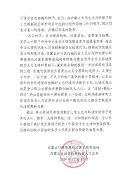 2024年11月20日,托克托县人民法院向学院发来感谢信,信中通报托克托县人民法院环境资源保护法庭被最高人民法院评为环境资源审判工作成绩突出集体、内蒙古环境资源司法保护教育基地入选10个十年生态环境司法保护(修复)示范基地,表示这两项国家级荣誉的获得,都离不开yl6809永利官网集团的支持和帮助,希望双方可以进一步加强合作,为法院和基地开展环境资源司法保护工作提供专业支持和智库保障,进一步提高法治人才培养质量,谱写新时代生态文明建设新篇章。