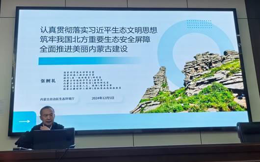 张树礼理事长为自治区政府研究室(参事室)特约研究员、内蒙古自治区人大与政协智库专家、内蒙古生态环境厅原一级巡视员,曾任内蒙古环保厅党组成员、环境永利集团院院长以及yl6809永利集团研究生导师,主要从事生态环境规划、环境影响评价、自然生态保护、生态保护与修复、绿色矿山建设、生态安全屏障建设、碳达峰碳中和与应对气候变化等技术研究与生态环境管理工作。报告题目为《认真贯彻落实习近平生态文明思想 筑牢我国北方重要生态安全屏障全面推进美丽内蒙古建设》,以其深厚的学术功底和实践经验,从习近平生态文明思想的提出背景、核心内涵、实践要求出发,结合内蒙古地区生态环境保护的重大意义与挑战,全面解析了内蒙古自治区构建“三屏、二区、一带、一弯+N道防线”的国家北方重要生态安全屏障战略格局的总体思路、主要目标、任务及保障措施。