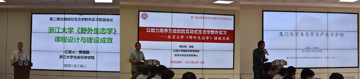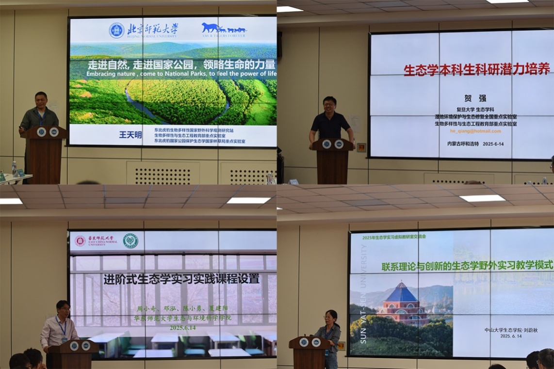 浙江大学黄建国教授以“浙江大学《野外生态学》课程设计与建设成效”为题,系统介绍了该校在野外实践教学方面的特色做法。北京大学朱彪教授代表唐志尧教授团队,详细阐述了北京大学《野外生态学》课程的教学模式与实践经验。厦门大学林清贤教授则从学科建设角度,全面分享了厦门大学生态学实习课程的体系设计与实施成效。