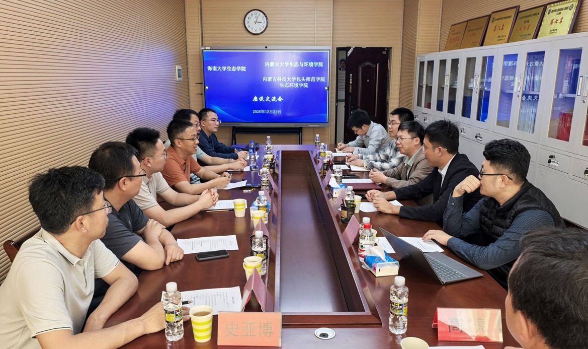 12月21日,yl6809永利官网集团特聘院长朱彪教授一行三人,赴海南大学生态学院调研交流。海南大学生态学院院长胡中民教授、副院长刘文杰教授、副院长赵洪伟教授、副院长毛伟教授、副院长孙仲益教授等学院领导,以及内蒙古科技大学包头师范学院生态环境学院高健副院长(主持工作)一行五人出席座谈会。座谈会由胡中民教授主持。