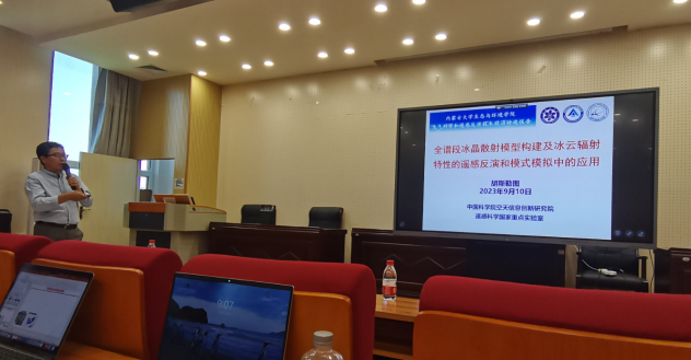 胡斯勒图研究员做“全谱段冰晶散射模型构建及冰云辐射特性的遥感反演和模式模拟中的应用”学术报告